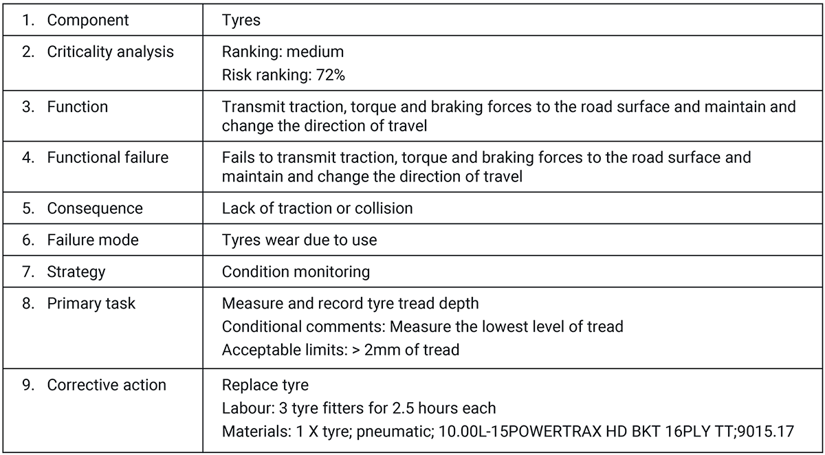 Orien is designed to develop end-to-end maintenance tactics at scale - for every component on every asset across an organisation. In this example, we follow the 9-step framework for a haul truck, focusing specifically on one component – the tyres. Comprehensive tactics development concludes with identifying corrective activities, complete with resources such as labour and materials. Corrective actions are triggered when primary inspection acceptable limits are exceeded. In this example, when tyre tread is less than 2mm, corrective actions are triggered to replace the tyre.
